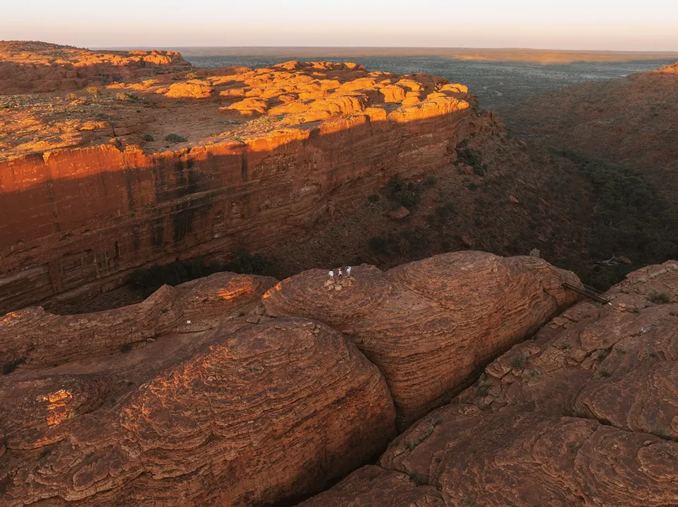 Continuez votre route sur l'Explorers Way jusqu'au parc national de Watarrka et le fameux Kings Canyon, ou optez pour un trajet aérien pour des points de vue à couper le souffle. À votre arrivée, partez en randonnée pour explorer les vastes paysages du canyon, ses spectaculaires parois de grès de plus de 300 m de haut et les palmiers cachés dans les infractuosités des rochers, et offrez-vous une perspective unique avec un survol en hélicoptère au coucher du soleil.